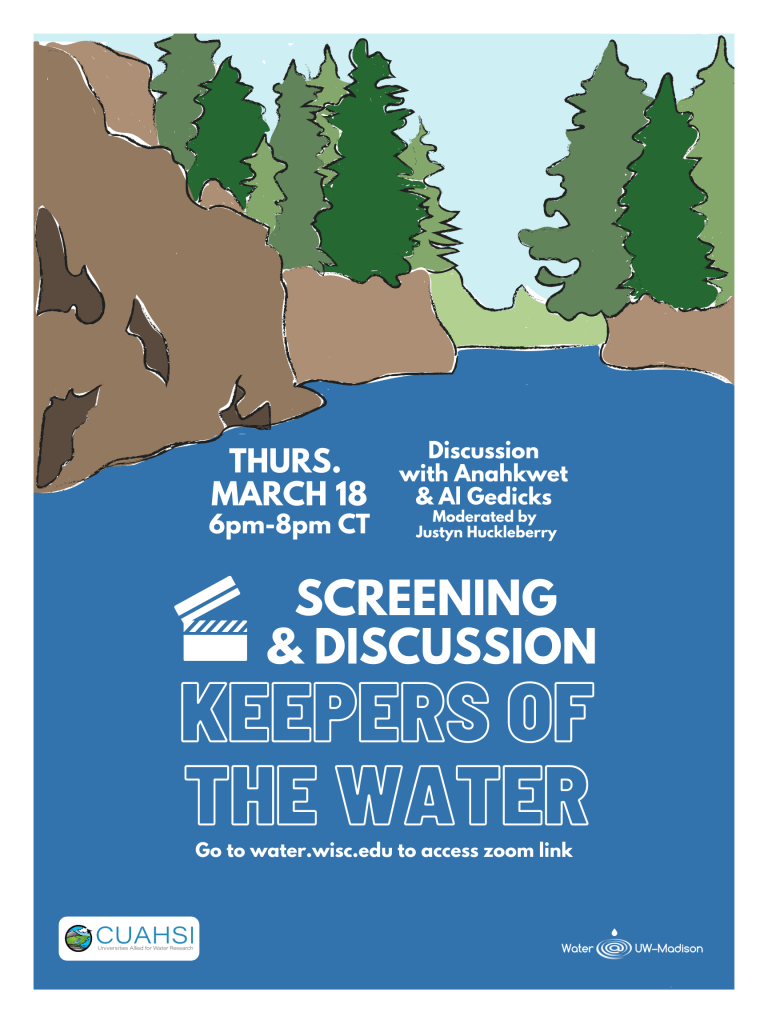 Post-screening discussion of Keepers of the Water, a 1996 documentary produced by the Wisconsin Resources Protection Council featuring the activists who eventually helped defeat the Crandon mine proposal (watch it here before viewing the discussion!). Water@UW-Madison hosted a screening and discussion with Director Al Gedicks & Anahkwet (Guy Reiter), Executive Director of Menīkānaehkem, Inc. The panel was moderated by UW Doctoral Candidate Justyn Huckleberry and put on with support from the Consortium of Universities for the Advancement of Hydrologic Science (CUAHSI) and Wolf River Action Committee.